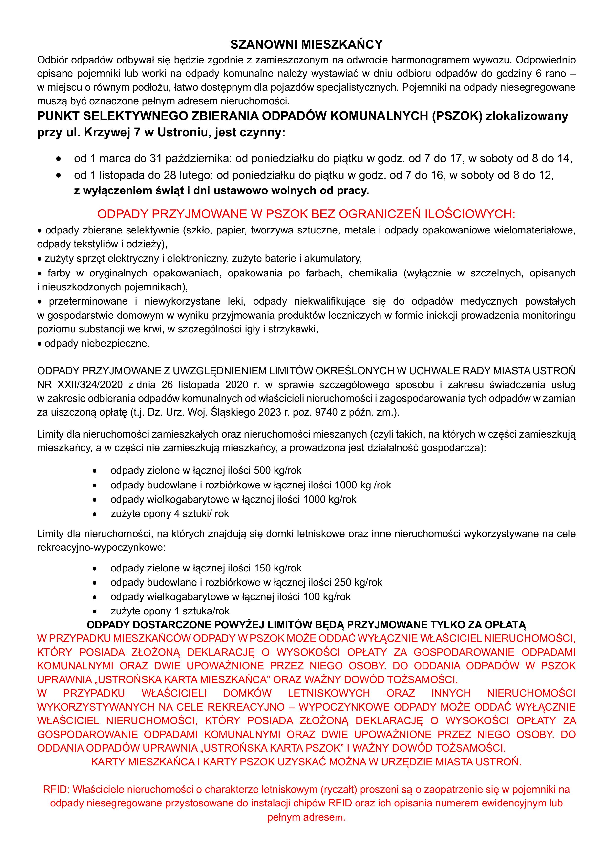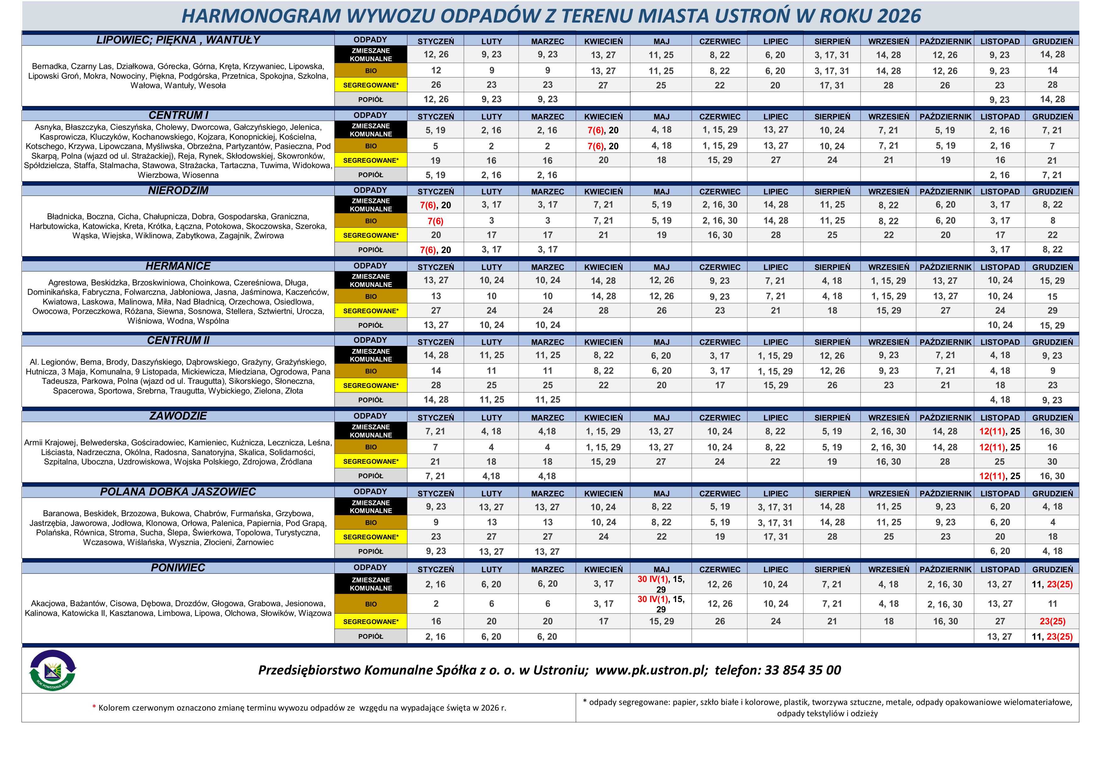 Harmonogram odbioru odpadów komunalnych z terenu Miasta Ustroń w roku 2026